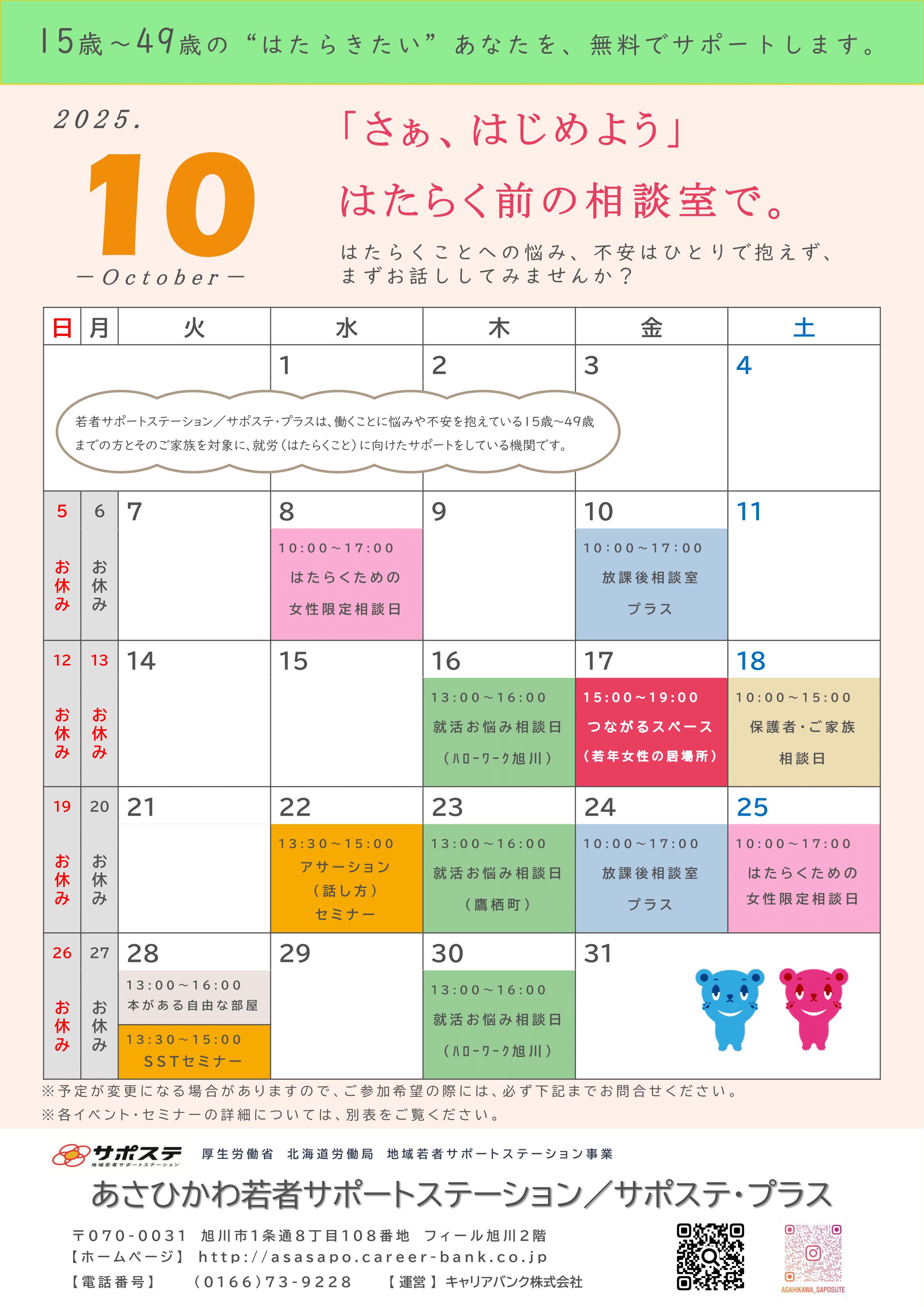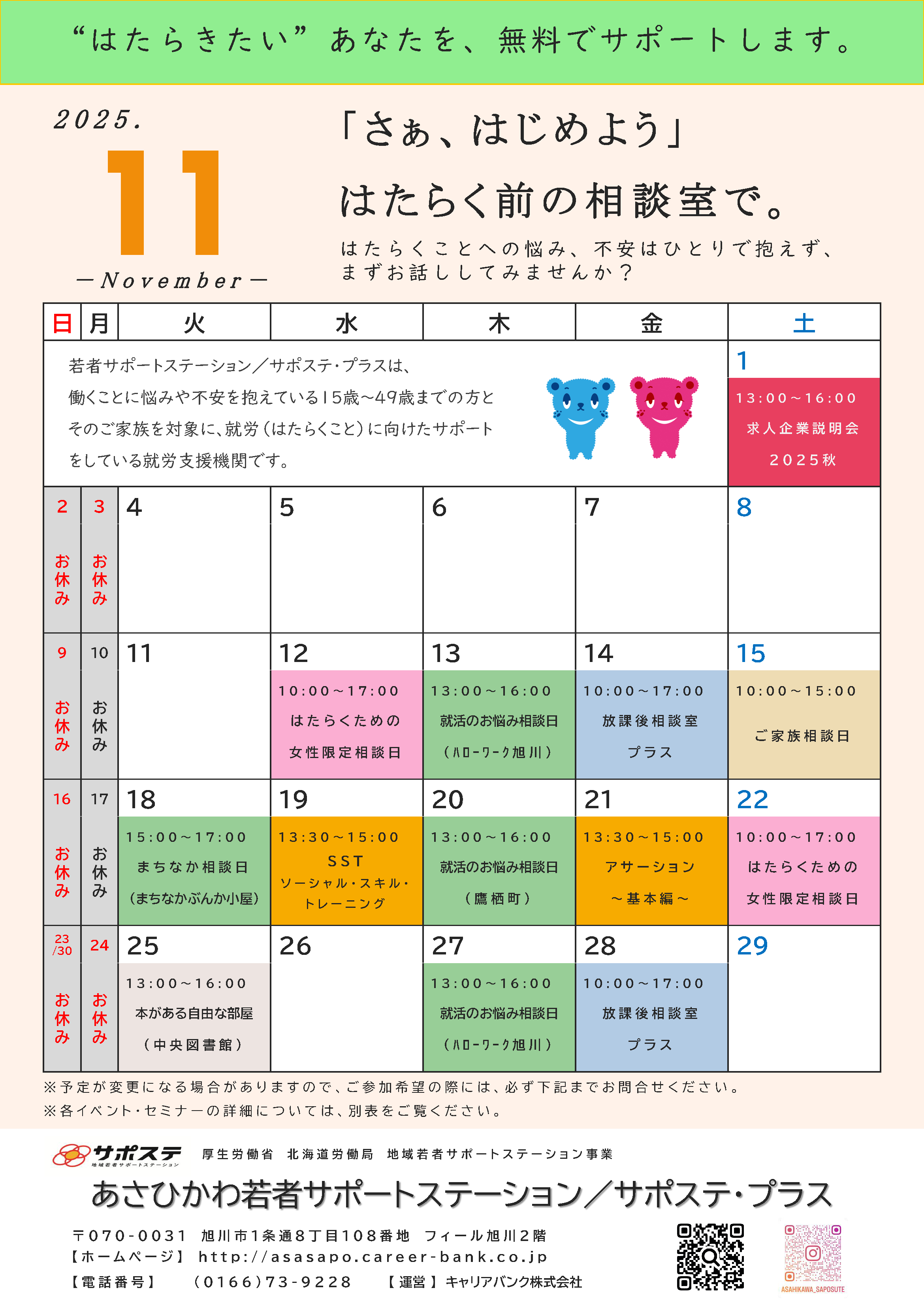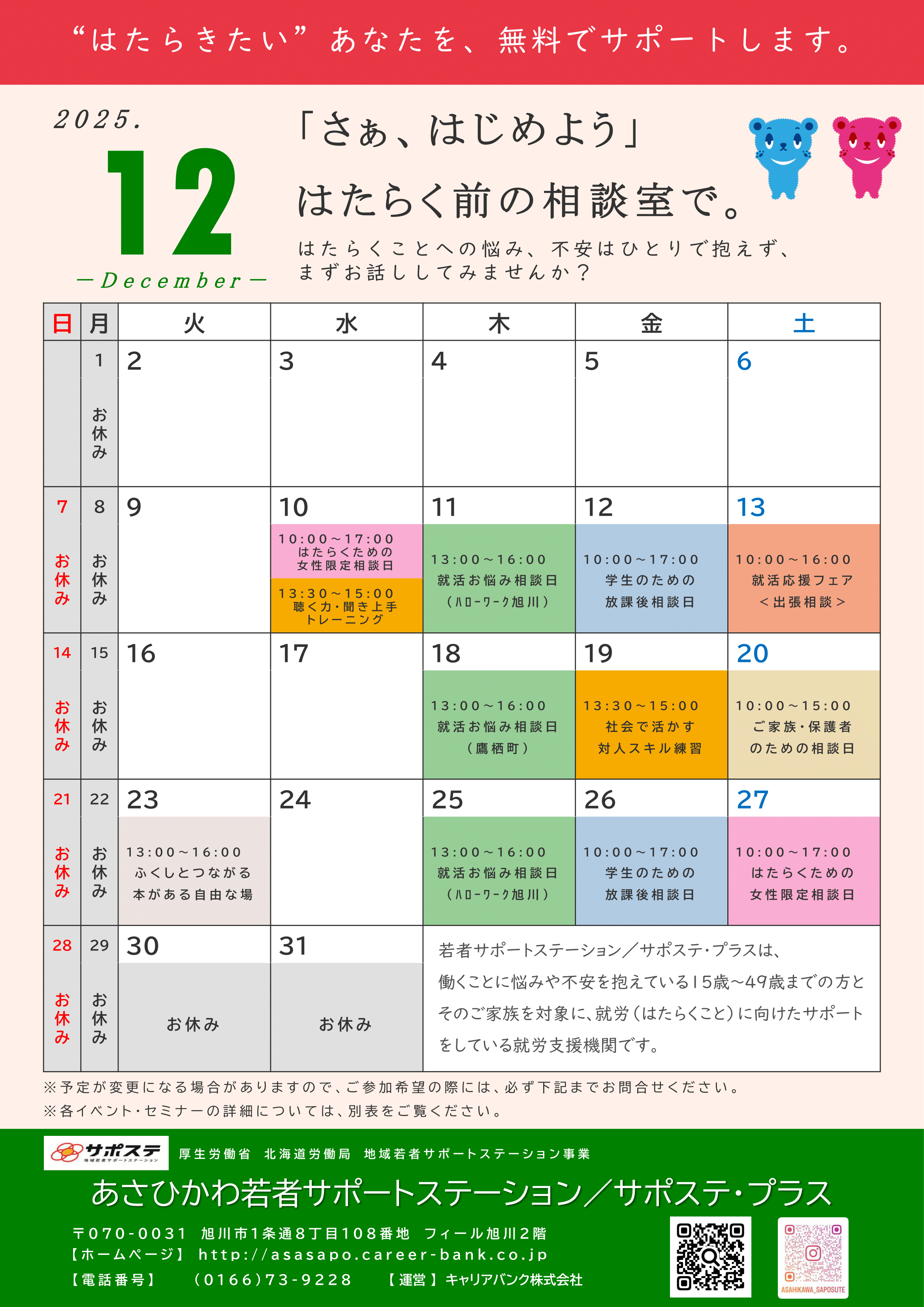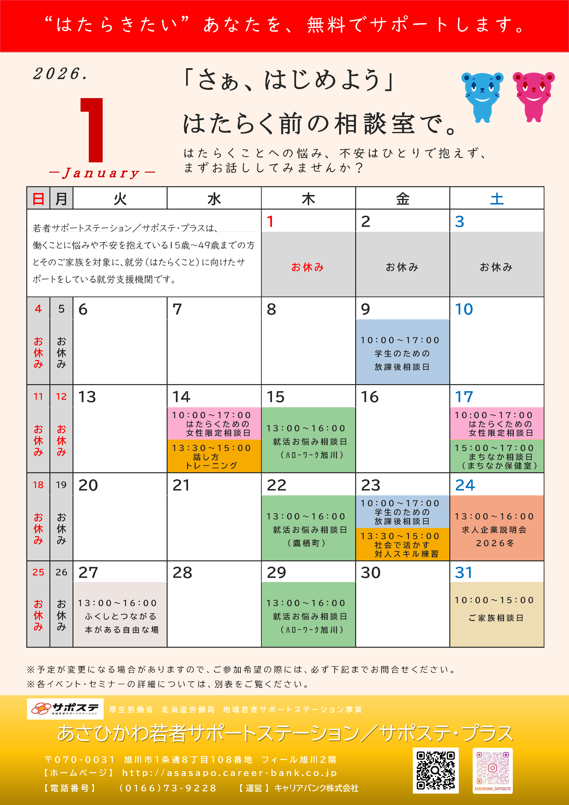 厚生労働省委託事業 あさひかわ若者サポートステーション 「就労」・「自立」の一歩を踏み出す、あなたのサポートをします phone0166-73-9228